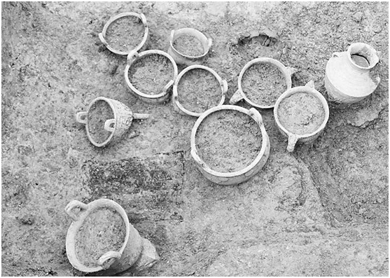 这个“铜器”呈扁状,身上铆钉样地鼓起很多小丁,上口细小下口宽大。“好像是古时候的编钟!”刘东林认出来了,因为20多年前,他们村出土过这样子的东西,听专家说是编钟——— 古代的乐器。抱出这个编钟后,继续拨开周围土层,6人惊住了:下面是一层摞一层的青铜器。