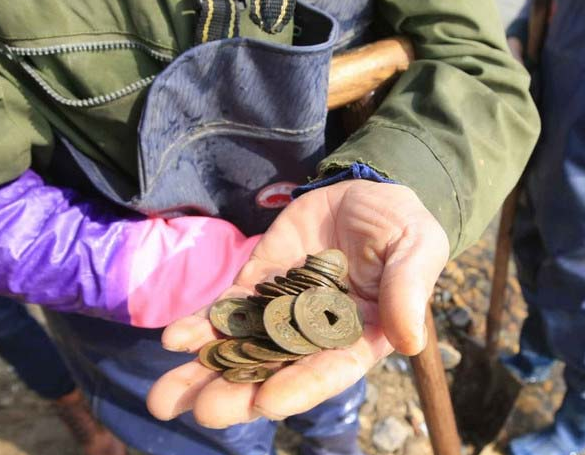 据了解,由于鄱阳湖进入枯水期,使得赣江古航道部分河床露出水面,位于鄱阳湖畔吴城镇居民自古相传此处曾经是古战场,水底可能藏有大量宝贝。古航道部分河床露出水面后,每日有数十名附近居民来此处挖掘宝贝,多时每人一天可挖到明、清时期的古钱币20枚左右,偶尔也会挖出一些瓷器、残玉等物品。
