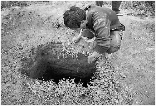 记者看到,这两处大坑挖得相当专业,坑口呈长方形,长约1.2米、宽约50厘米,坑壁被依次挖出很多小洞,当作下坑的阶梯,在坑的中间部位,还有一个土质台阶。在坑底南侧,可以看出还挖有通道。另一处大坑已被回填,但从未填充的部分可以看出,挖坑手法与另一大坑相似。刘先生记得以前在自家土地里挖到过很多铜钱。不知道这些人是那里得到的消息来自家的地里探宝。