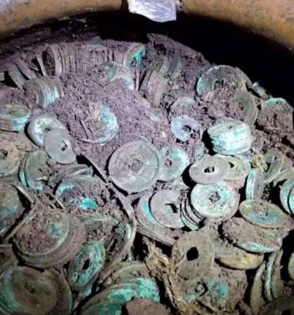 小伙十分快乐,拿着铲子就开挖,最初终于在大约一米多深的中央挖出来两个罐子。挖出来的罐子十分的破旧,下面也没有盖子盖子。小伙子看着都有些绝望,但是还是把两个罐子都放到地上去了。罐子拿在手里后,发现还挺沉。小伙子一想,终究有没有东西,还是看看再说。后果刚扒开下面的浮土后,小伙子就快乐坏了。外面都是一些生满了铜锈的钱币。