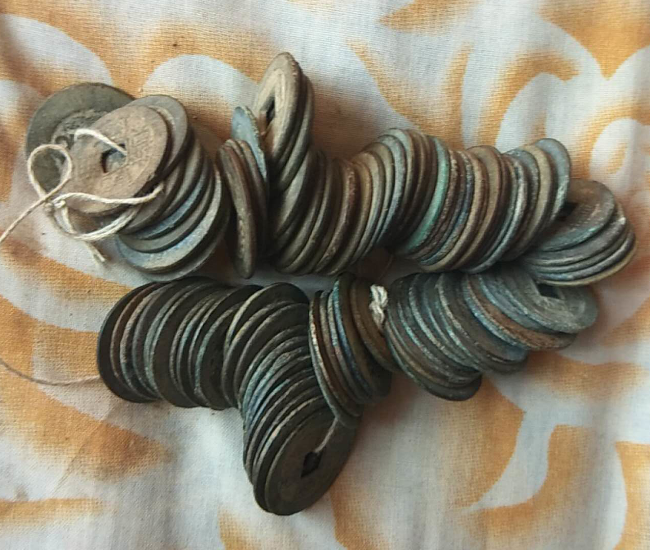 湖北省荆门市荆门县江山村周某使用费舍尔黄金虫地下金属探测仪器找出大量的铜钱。