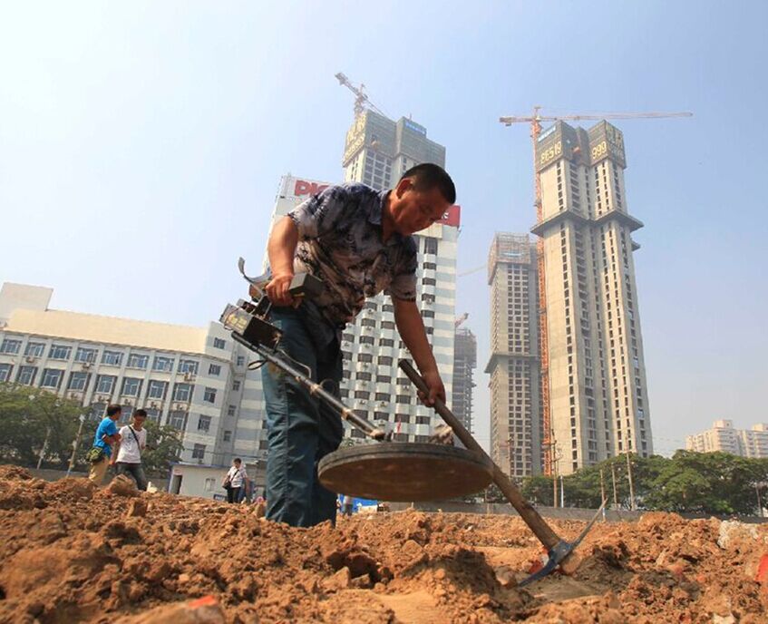 2014年10月30日,河南省郑州,男子每天带着在广州易探购买的“GS600金属探测仪”奔走城市拆迁地中。