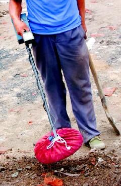拾荒者利用探测器 探测地下“宝藏”