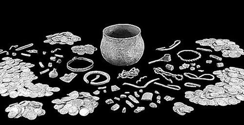 英国《邮报》22日报道,这对父子在英国一处农田发现800多年前的藏宝,总价值约在一百万英镑(约200万美元),是英国150年来最具价值的藏宝发现之一。发现藏宝的这对父子家住英国。父亲戴维•韦兰现年60岁左右,儿子安德鲁•韦兰现年35岁。父子二人都是探宝喜爱者。今年1月6日,韦兰父子在哈罗盖特镇附近的一处农田使用美国T2金属探测器寻宝时,金属探测器突然发出声音。他们立刻挖土地,挖到地下约40厘米深时,发现宝藏——一个镀银大碗。随后,韦兰父子把银碗交给考古专家鉴定,结果令他们喜出望外。碗中居然装有大量珠宝和钱币。考古专家说,银碗直径约13厘米,外面装饰有动物图案,于公元9世纪在法国北部制造。银碗中装有617枚各式银币,来自爱尔兰、法国、俄罗斯、阿富汗和斯堪的纳维亚等国家和地区。此外,碗中还有一个足金臂环、多条足金项链、胸针和一些未经加工的银块。专家估计,这笔宝藏总价值约为100万英镑(约200万美元),保守估价为75万英镑(约150万美元)。根据英国法律,韦兰父子可以得到财富的一半,而另一半将归宝藏发掘处的农民。