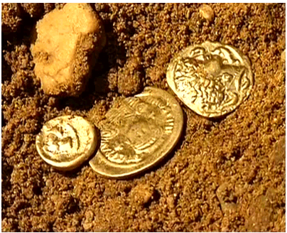 深圳安某,10月2号与一些探宝爱好者一起去到野外探宝。刚开始还跟朋友打赌说看谁的仪器好,能找到宝物。行动大概两个多小时候安某的赏金猎人显示有贵重金属,大概在中层深度。挖下去大概两米左右就发现了数枚金币,这真是意外的收货。