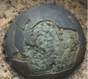 这些古币被装在一个大罐子里埋在地下大概1米深处,钱罐由一位探宝爱好者发现。探宝者表示,他的探测器当时发出十分奇异的信号,这促使他决定向地下挖去。他说:“我把手伸下去,挖出一些黏土 ,发现有一个小青铜罗马硬币,它非常非常小,和我手指甲差不多大小。多年来我挖掘出很多物体,但是,这次是我第一次发现这么多古币。”