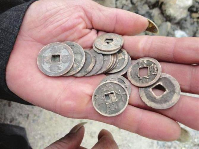 江苏新沂市区武装部附近近日城中村改造有人利用探宝仪器在勾出来的渣土中找到大量铜钱。