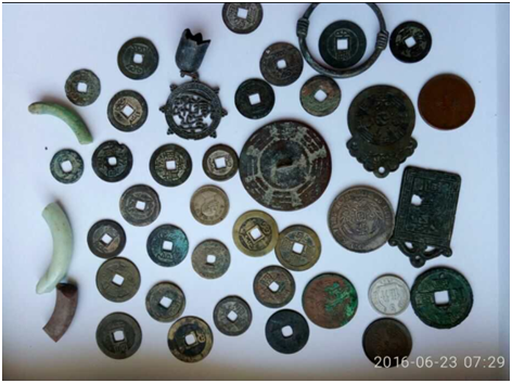 之前有好几次跟着朋友一起到野外四处寻宝什么都没找到, 前几天借用叔叔家的一台美国T2可视黄金探测器再次到野外寻宝.也是跟往常一样跟几位朋友带着仪器在野外四处寻找,不过这次很幸运只花了几个小时就找到这些宝贝了.