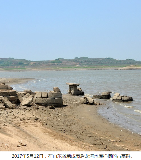 据报道,2017年5月12日,山东荣成后龙河水库大片古墓群因水库水位下降引来了当地村民张某带着考古探测器前来寻宝发现了古墓,该古墓群为石制,或产生于金元时期。已露出水面的石墓有14座,水中还有10余座。