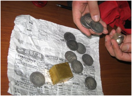 不一会就挖出一个大大的瓷罐出来,何大爷把它擦了干净,左看看,右看看,施工队的人都围拢来看了个热闹。看来整个罐口,都是用石灰膏封的口。他拿了一钢钎慢慢的敲,差不多有三十多公分的厚度,里面露出了白花花的银元。因为人多何大爷赶紧把罐子收起来收拾好东西准备回家了,回到家后将它倒了出来,数了一数,“哇”整整有五百块啊!他装回罐子,抱了起来,一边跑一边喊:“老伴,我们家发财啦,挖出了银子!”