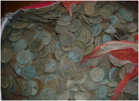 张某经过一段时候的了解,张某跟家里人商量后,经朋友介绍在广州易探网上订购了一款费舍尔黄金虫的地下金属探测仪器。经过一段时间对仪器的掌握。张某在家里的老房子、老房子周边都探测了一遍,仪器没有什么反应。当张某正要怀疑是否是祖上有没埋铜钱的时候,仪器在附近的一棵大树下发出了警报。张某使用工具挖下不到1米,发现了大量的铜钱。