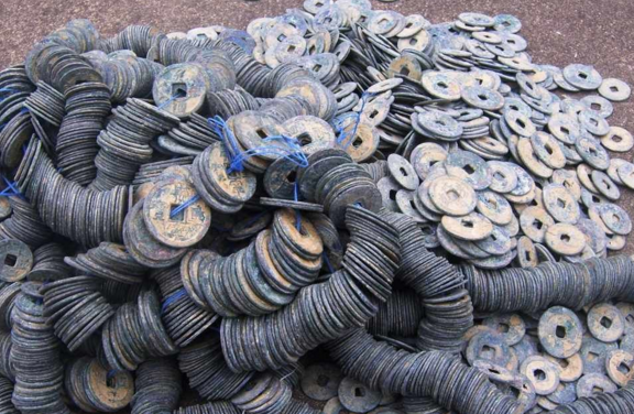 图为挖出的古钱